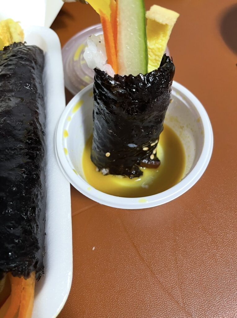 visually, the simplicity stands out. the surface shines from the sesame oil coating, and when you look at the cross-section, you’ll see minimal fillings: carrot, pickled radish, burdock root, and thin egg strips. the rice makes up most of the roll, encouraging you to focus on the flavor of the rice itself. despite the lack of flashy ingredients, this clean and humble look is trustworthy and represents a classic korean seaweed roll at its core.