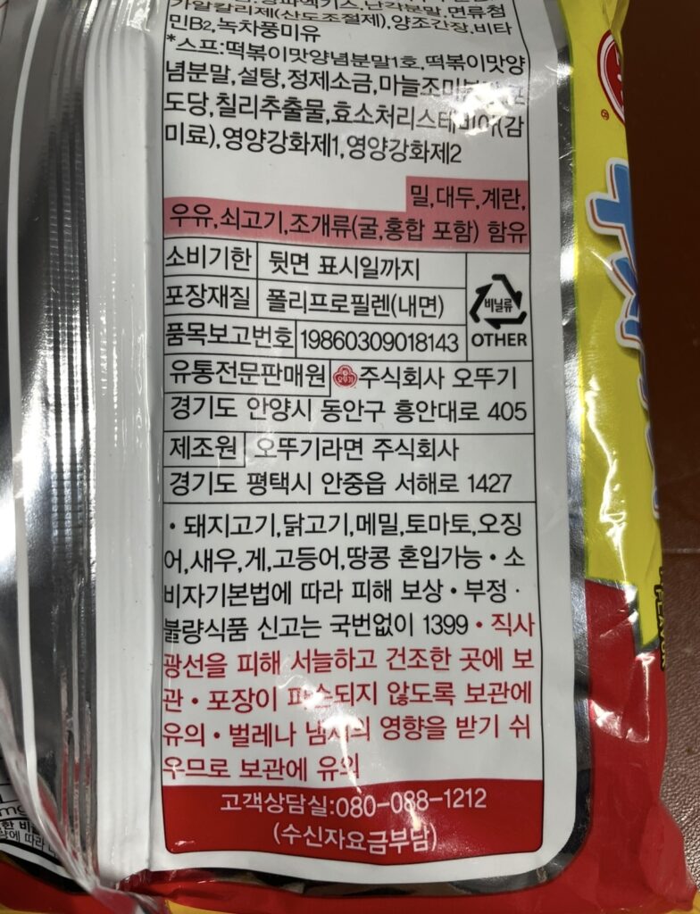 · Manufactured in a facility that also processes pork, chicken, buckwheat, tomato, squid, shrimp, egg, mackerel, etc. · Keep in a cool, dry place away from direct sunlight. · Ensure the package is not damaged before storage. · Compensation for defective products follows consumer dispute resolution standards. · To report unsafe food in Korea, call 1399 (no area code required). |