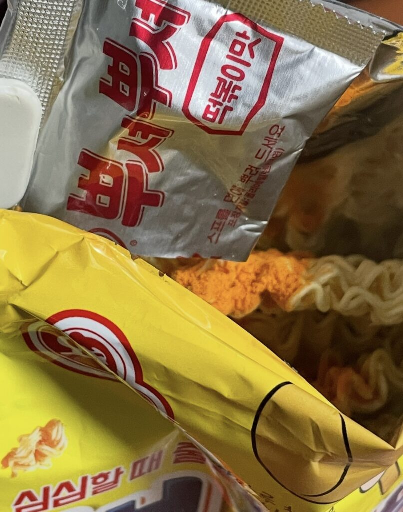 the noodles are thinner than regular ramen and light enough to crush by hand. the crisp snapping sound adds a pleasant auditory element, making it fun to prepare. this mix of sight, sound, and smell gives ppushuppushu tteokbokki its unique first impression.