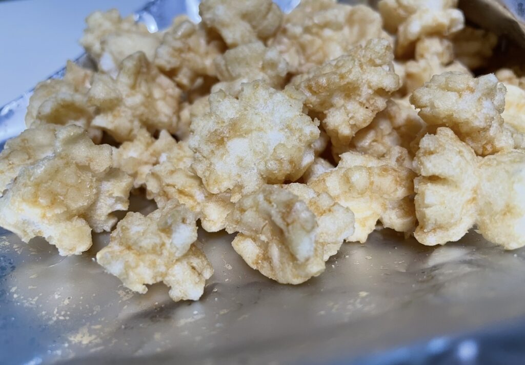 visually, ssallobyeol looks distinctly different from typical potato chips or flour-based snacks. it has a round yet irregular shape, resembling several small popcorn pieces clumped together. the surface is slightly yellowish and shimmers due to the seasoning. the size is small enough to pop into your mouth, but many ssallobyeol pieces are stuck or clumped together, resulting in irregular shapes—some large, some separate—which is an endearing point for this korean snack review.